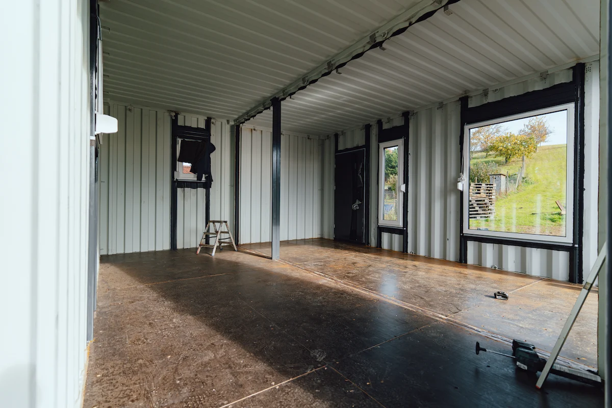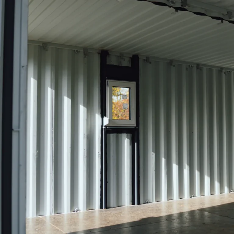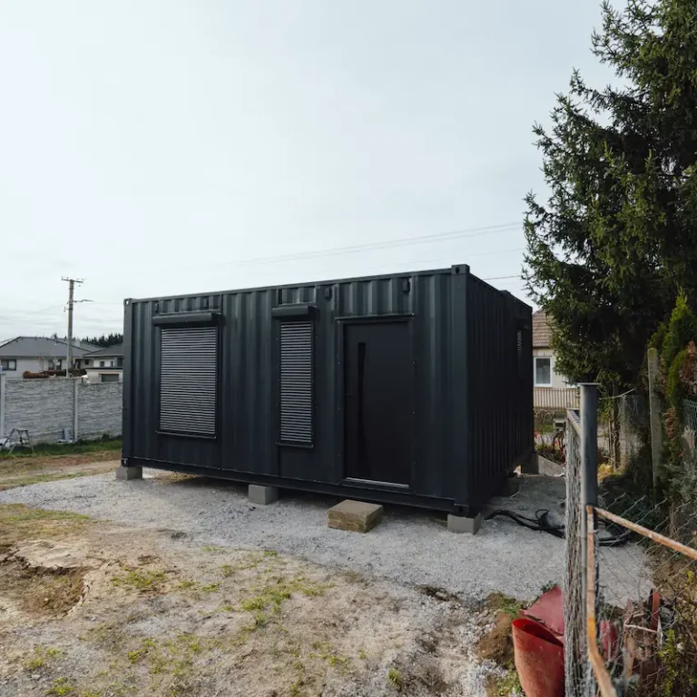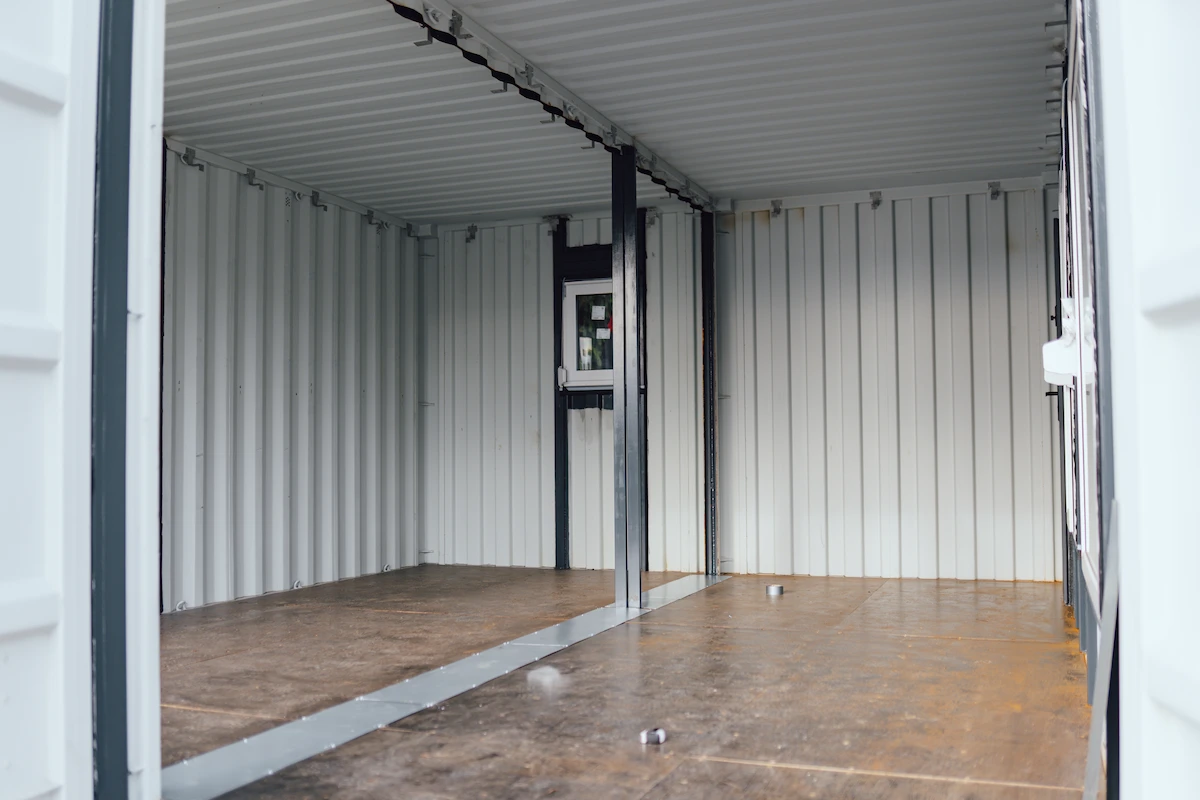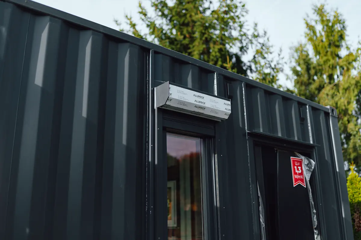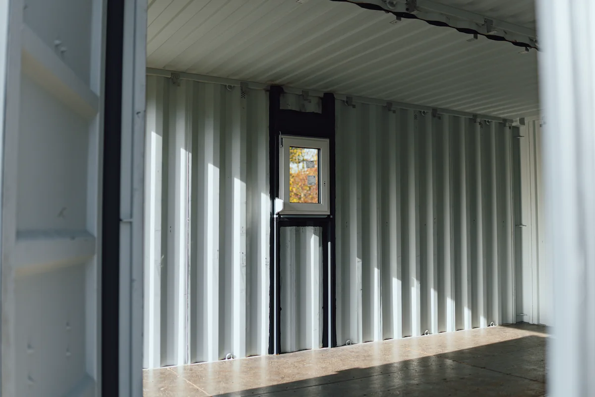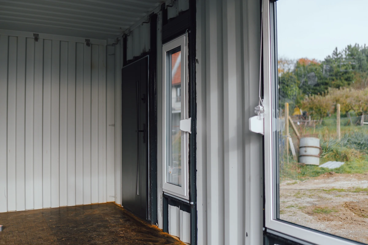Kontejnery byly doplněny o nová okna, dveře a připravené úchyty pro montáž sádrokartonu. Majitel tak může jednoduchým způsobem dokončit interiér a přizpůsobit si jej pro rekreační nebo pracovní využití.