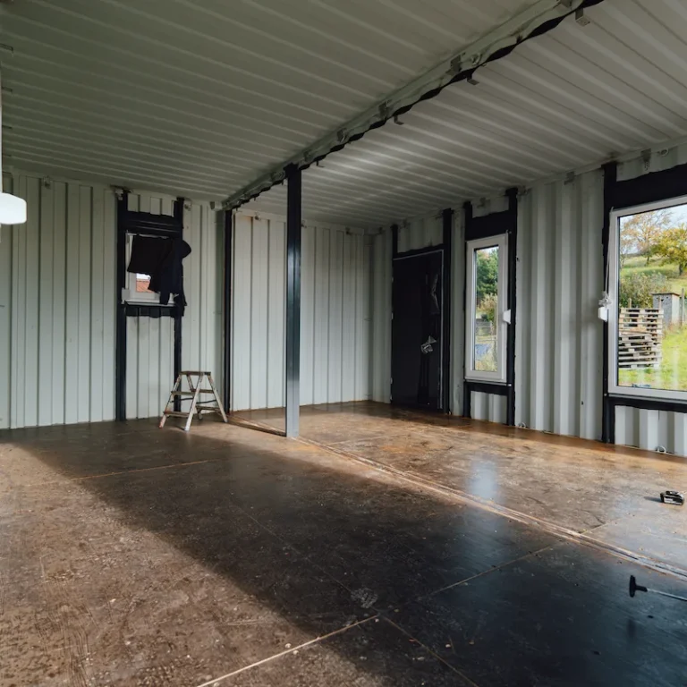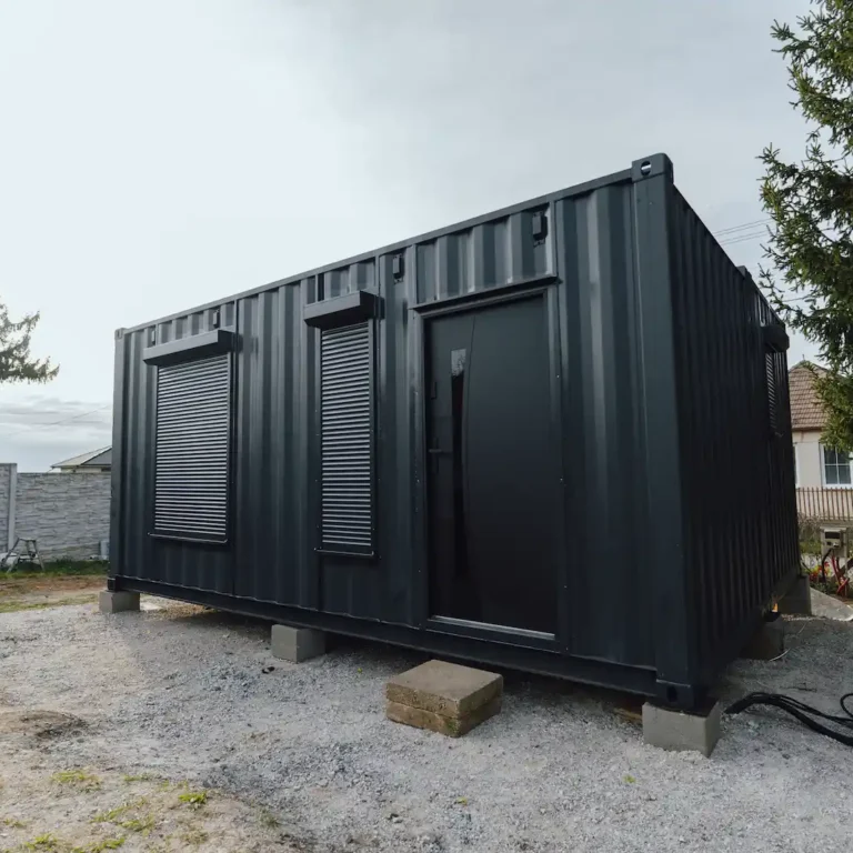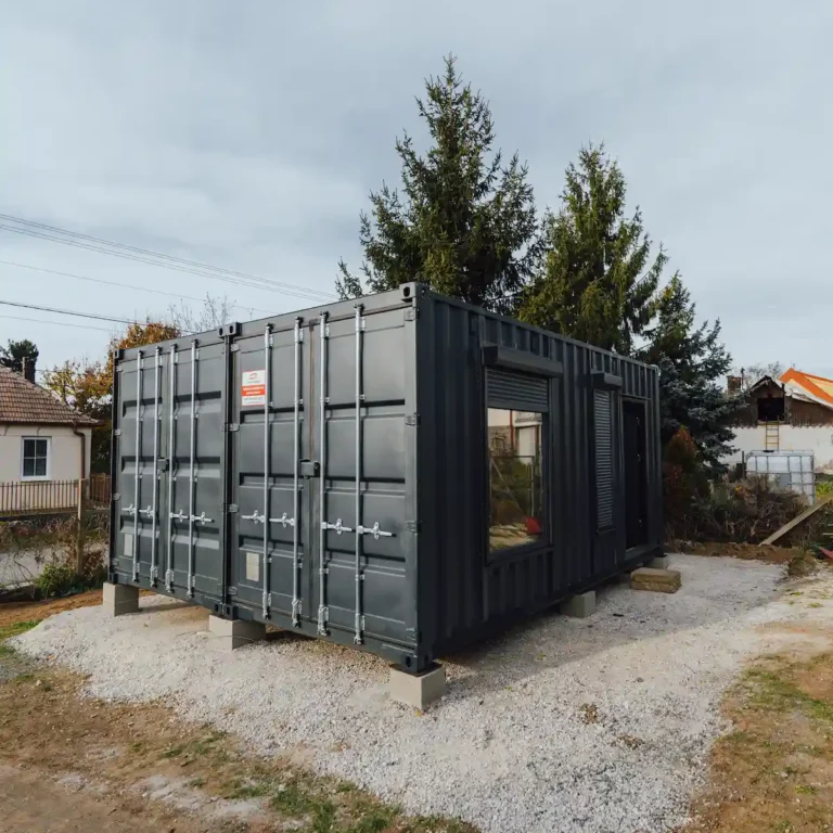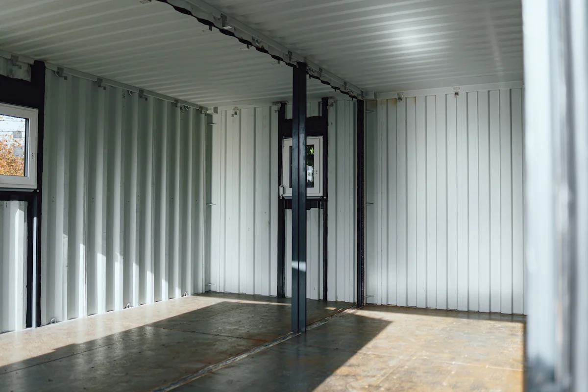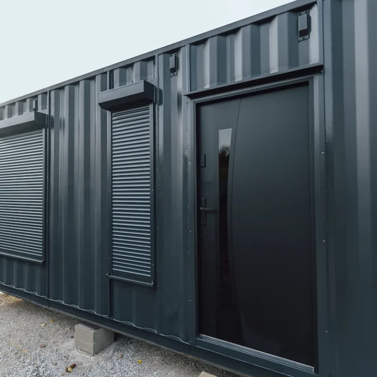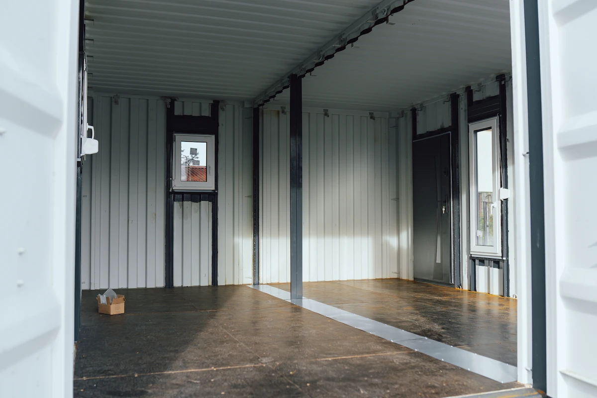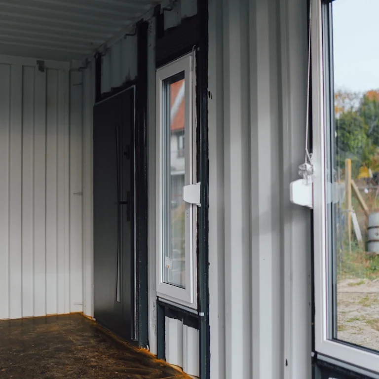 Kontejnery byly doplněny o nová okna, dveře a připravené úchyty pro montáž sádrokartonu. Majitel tak může jednoduchým způsobem dokončit interiér a přizpůsobit si jej pro rekreační nebo pracovní využití.